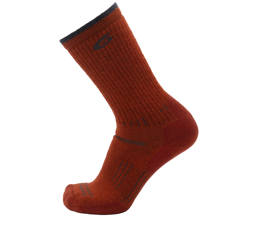 The Hiking Essential Medium crew sock offers extra cushioning on the instep and around the leg to protect against pressure points from heavier footwear. The cozy merino wool cushioning next to the skin insulates the foot from hot spots.